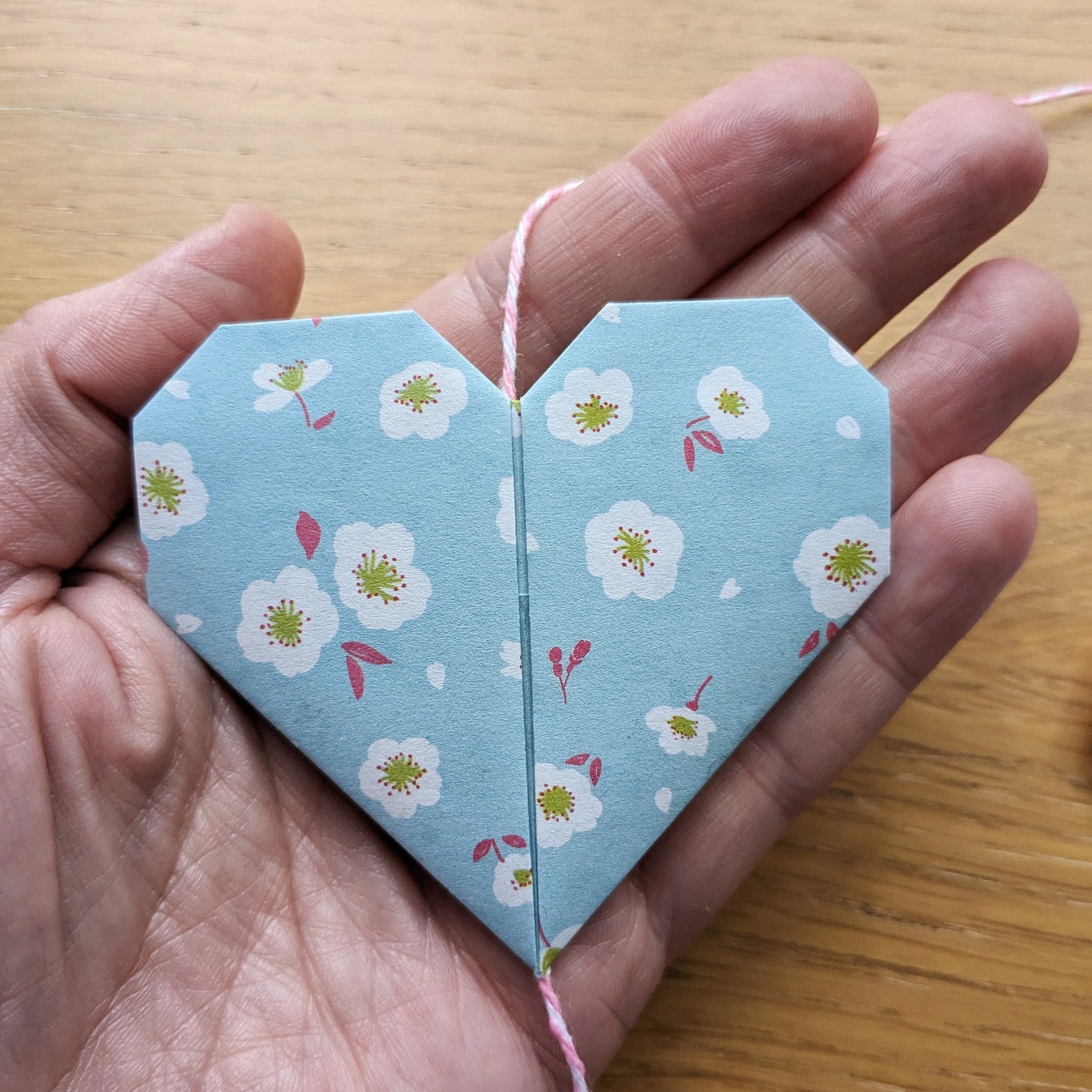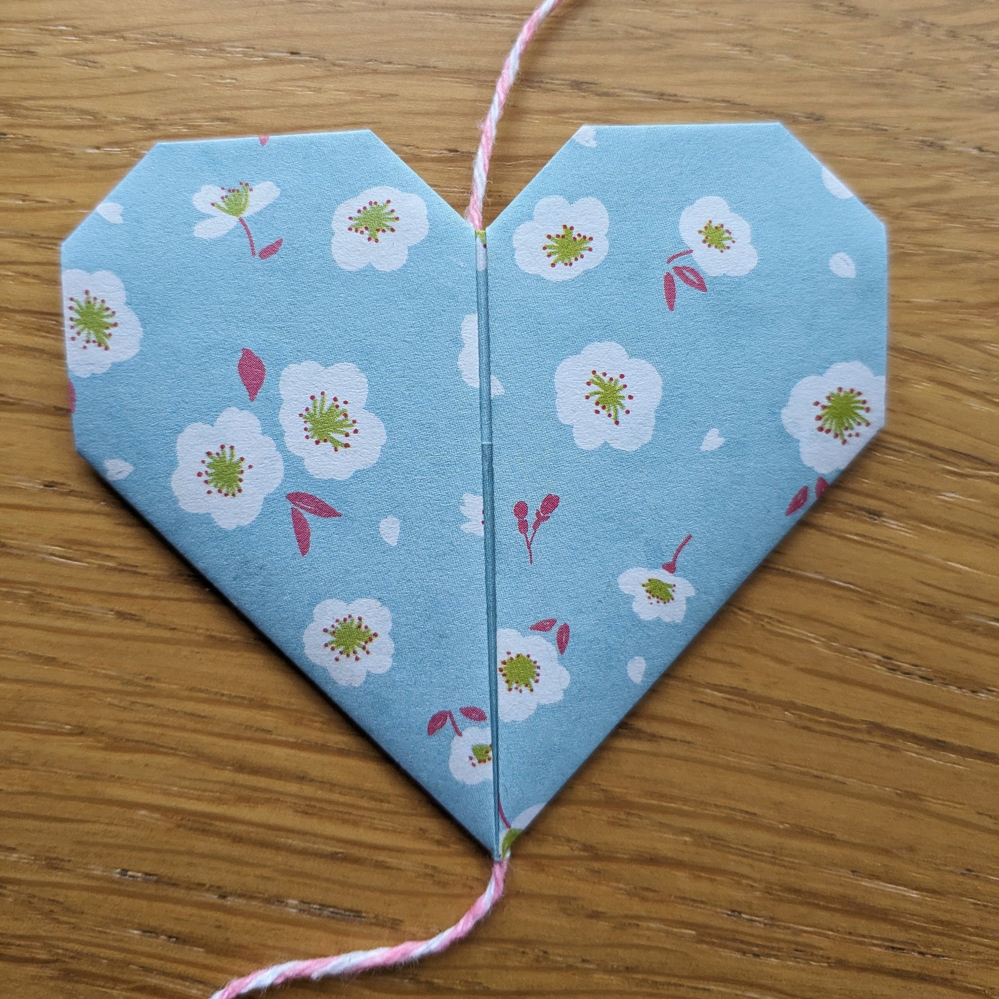 This vertical garland of five origami hearts is folded from pale blue paper with a cherry blossom pattern and will make a unique decorative addition to your home, brightening up a dull corner or hanging in a window.