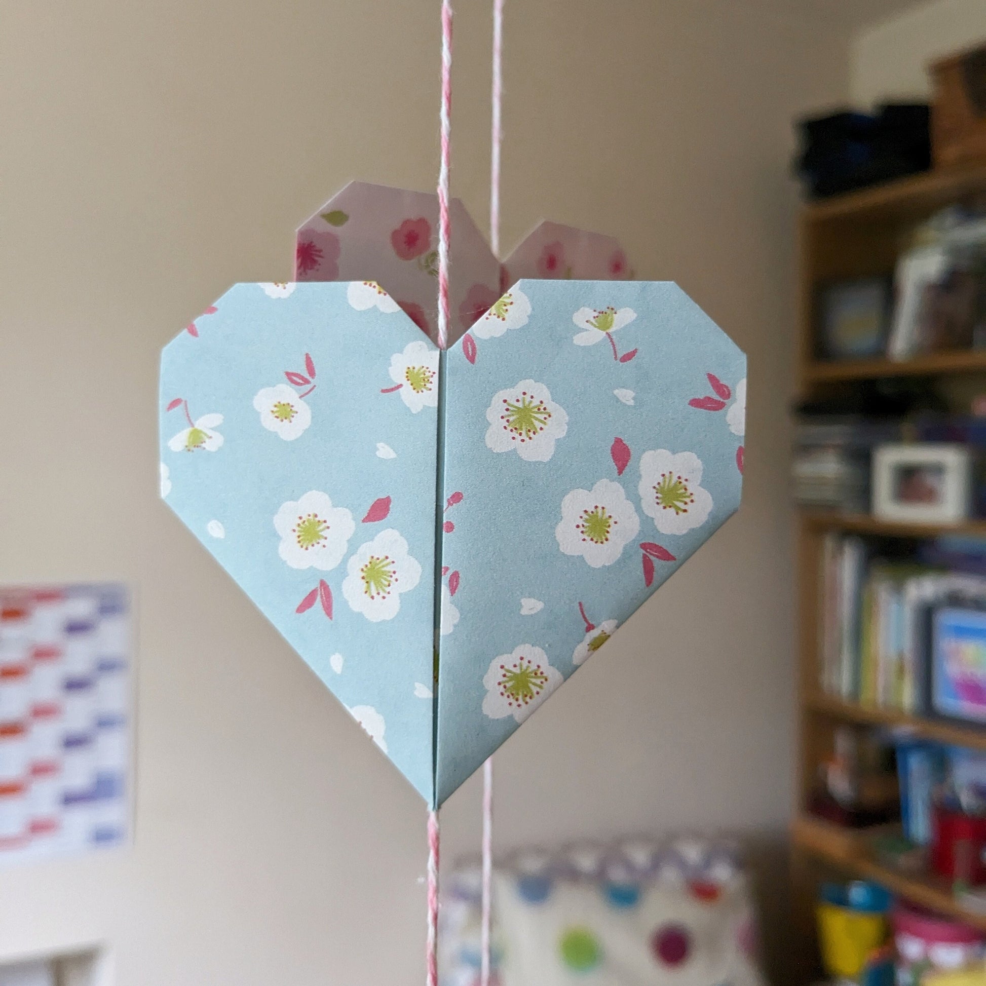 Each origami heart is folded from a single square of paper, they measure 8x8cm in diameter and are threaded onto cotton twine.