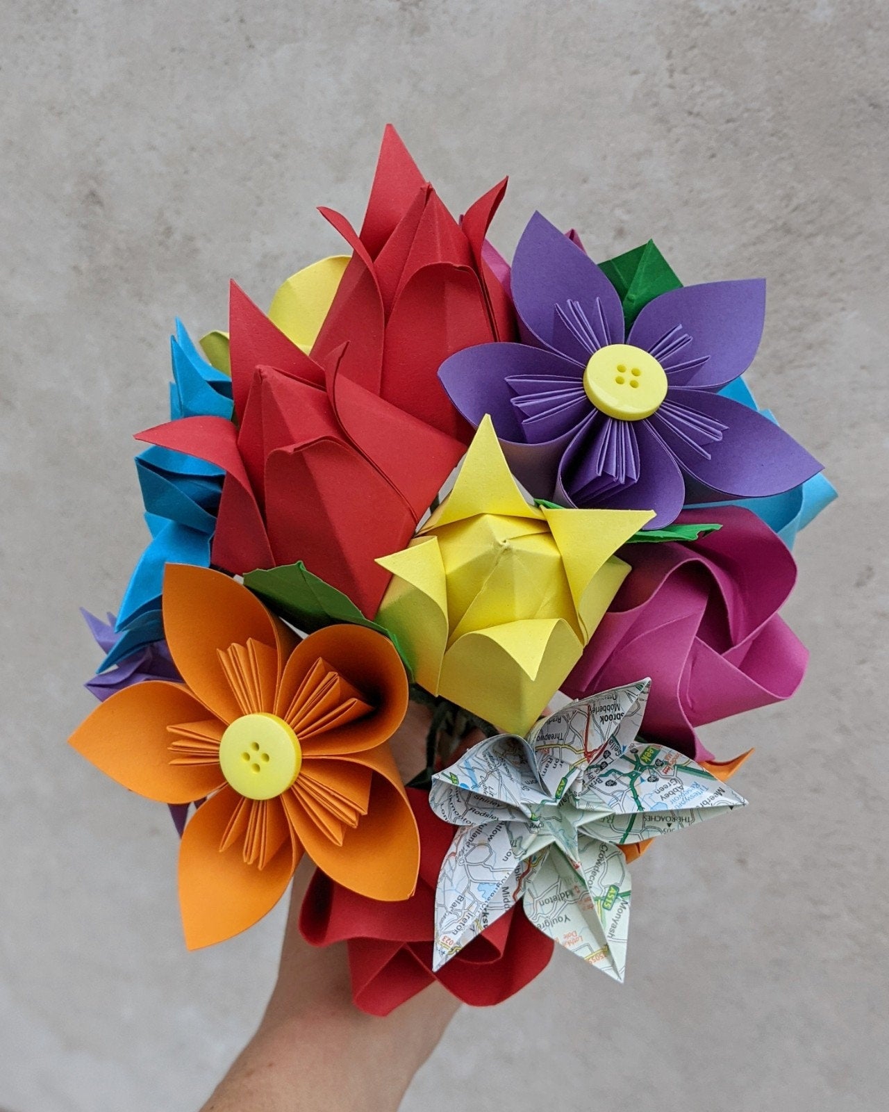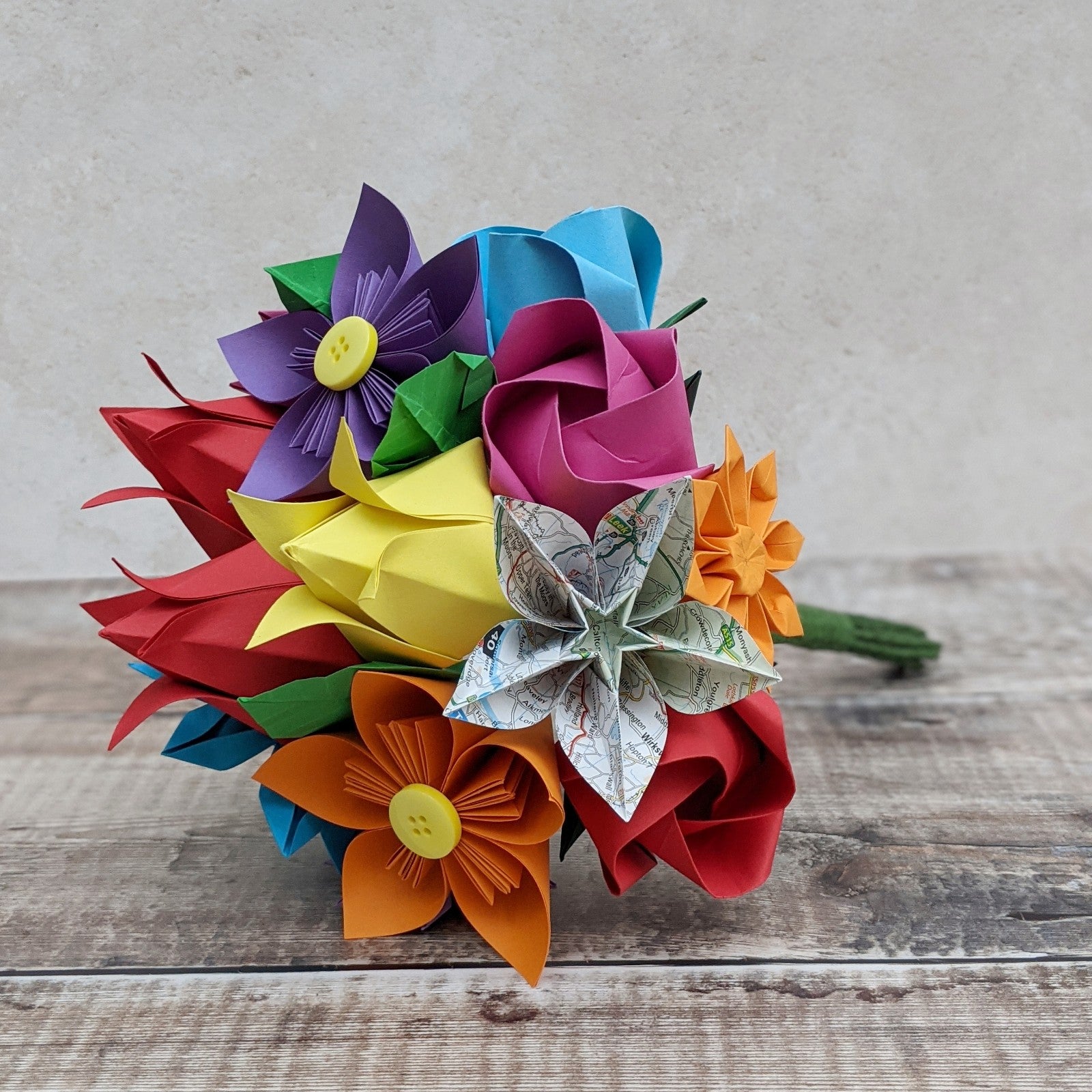 Colourful origami wedding bouquet with upcycled map paper flowers