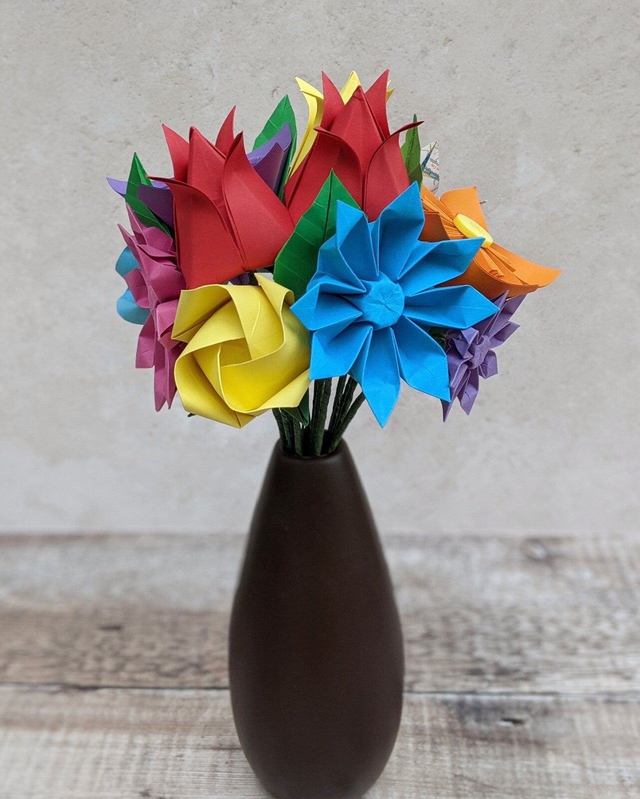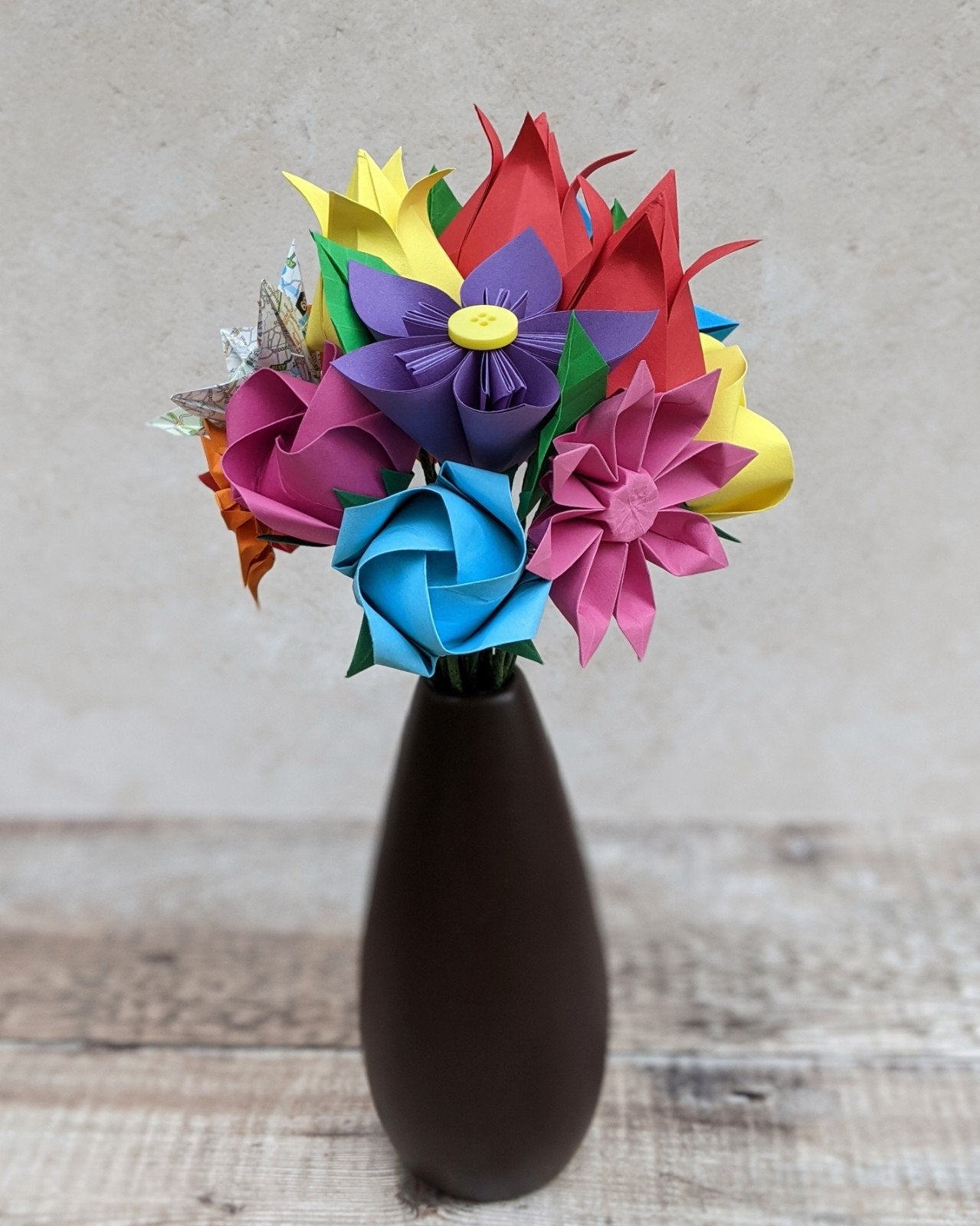 The paper bouquet features handcrafted tulips, roses, daisies, gerberas and star flowers, and is finished with origami leaves.