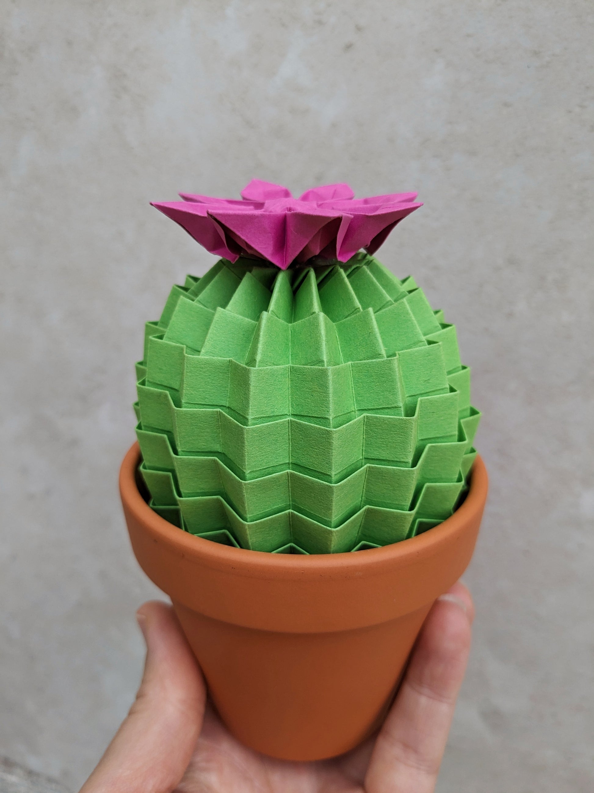 This is a large origami cactus handmade from lime green recycled paper and planted in a terracotta pot. It's decorated with a folded paper flower with eight petals in your choice of colour. This gorgeous faux cactus is eco- and vegan-friendly and looks super cute on a shelf or desk in your home office. It's the perfect birthday present for a cactus lover - this design is exclusive to Origami Blooms so they definitely won't have one like this in their collection! And it's a great gift for your friend who struggles to keep real plants alive because there's no need to water it.