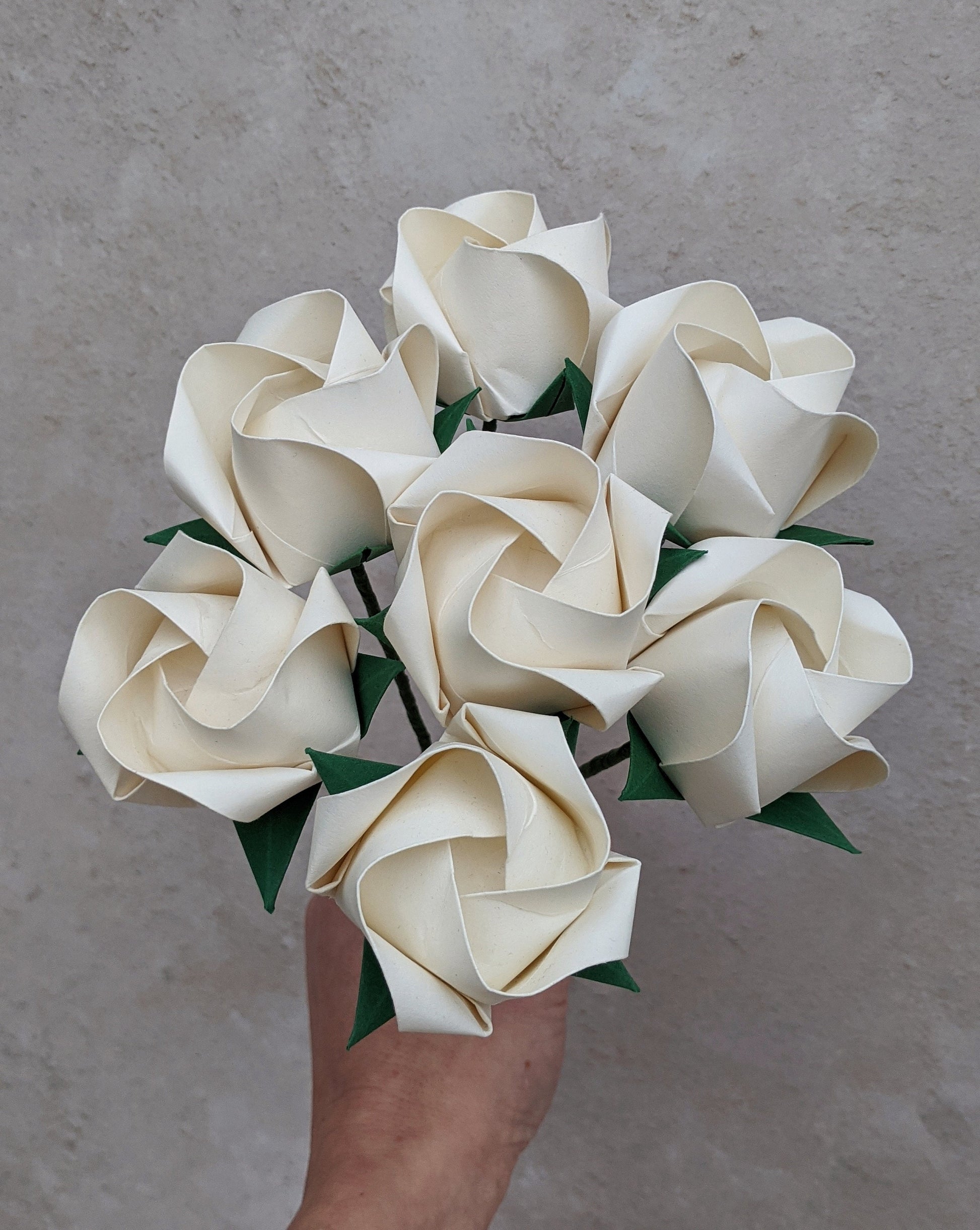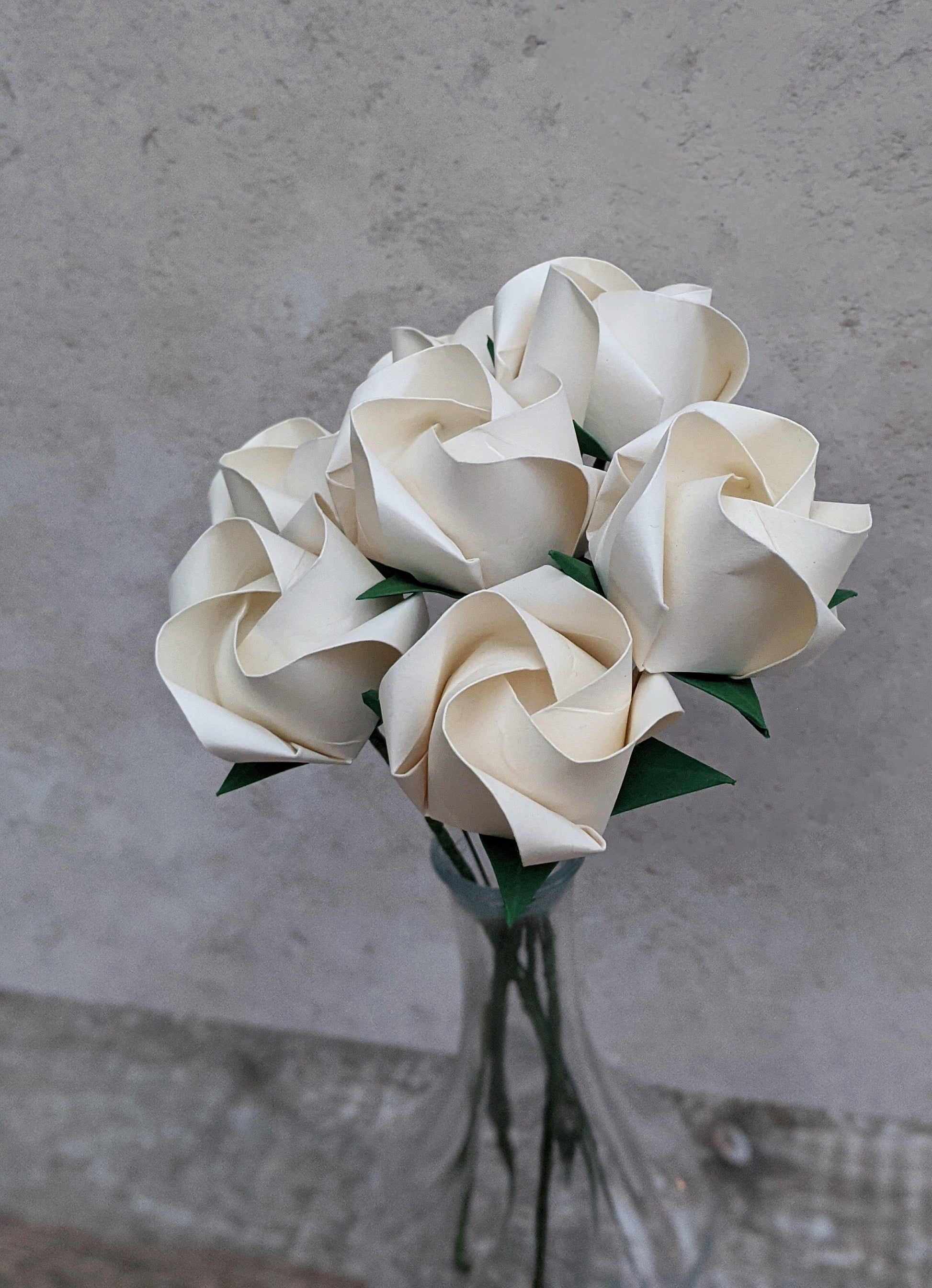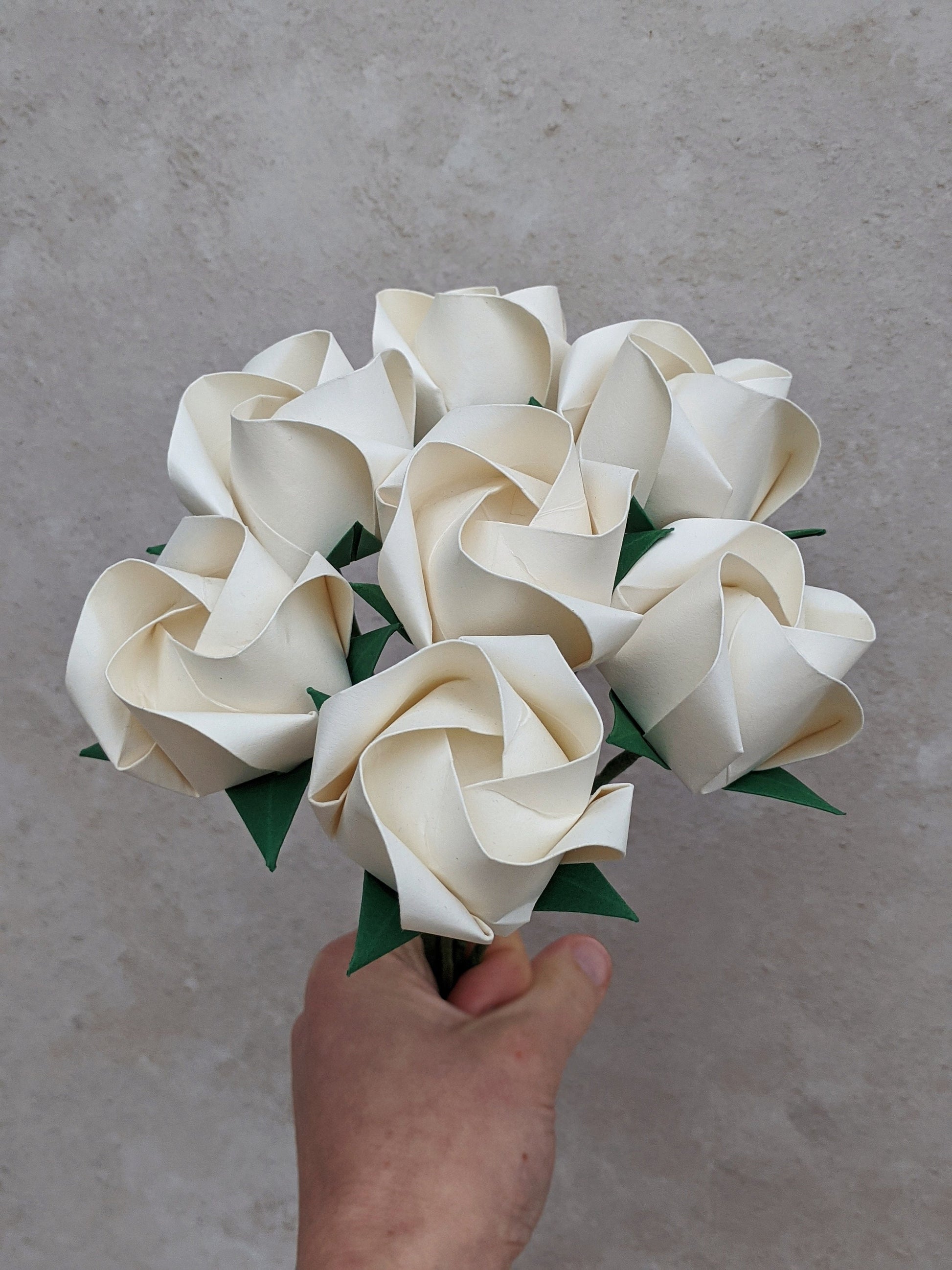 Here's a beautiful bouquet of seven exquisite ivory origami roses. Paper roses are the perfect choice for your wife on your 1st wedding anniversary as the traditional material for a first anniversary gift is paper. This paper flower bouquet makes such a unique and thoughtful present and it is handmade with love!