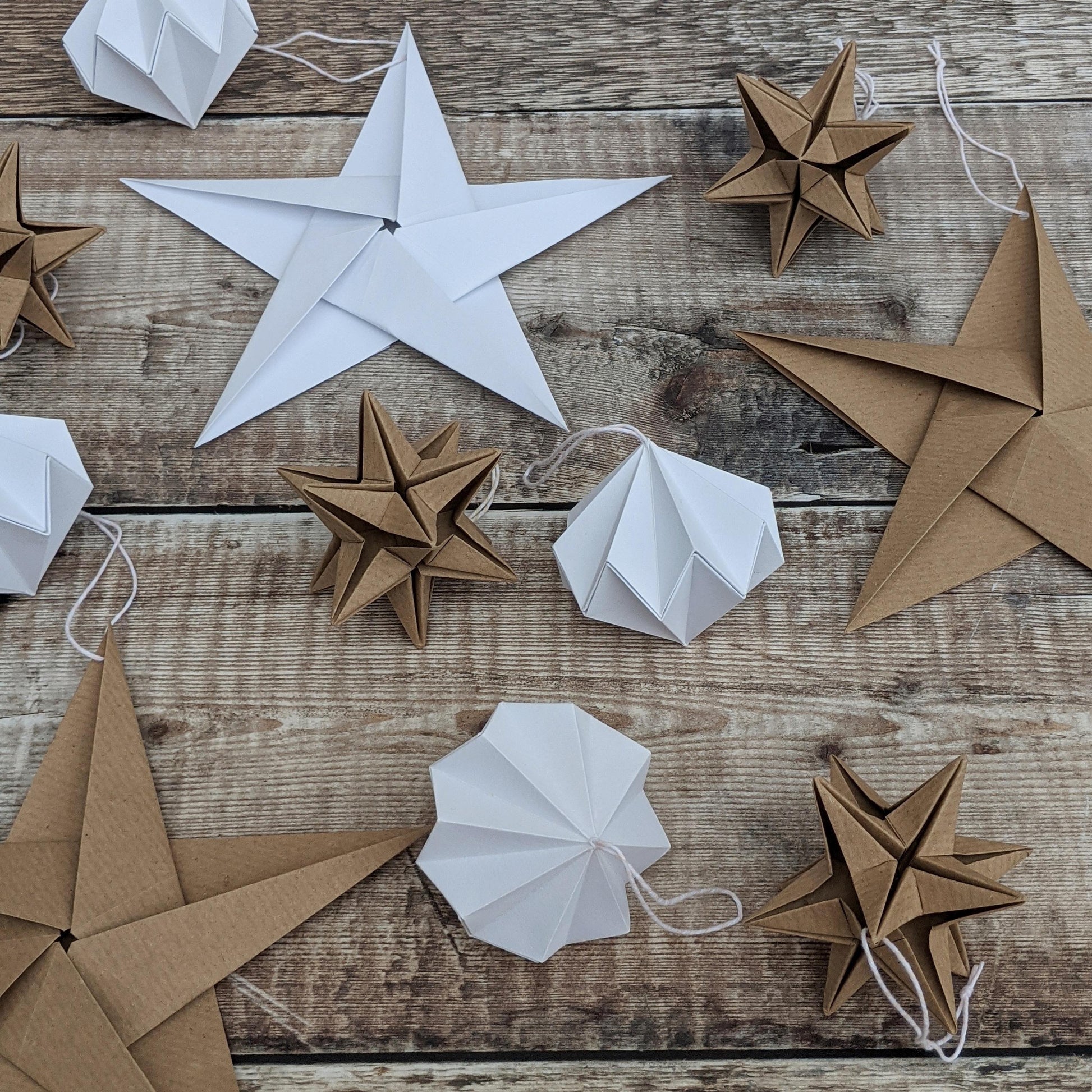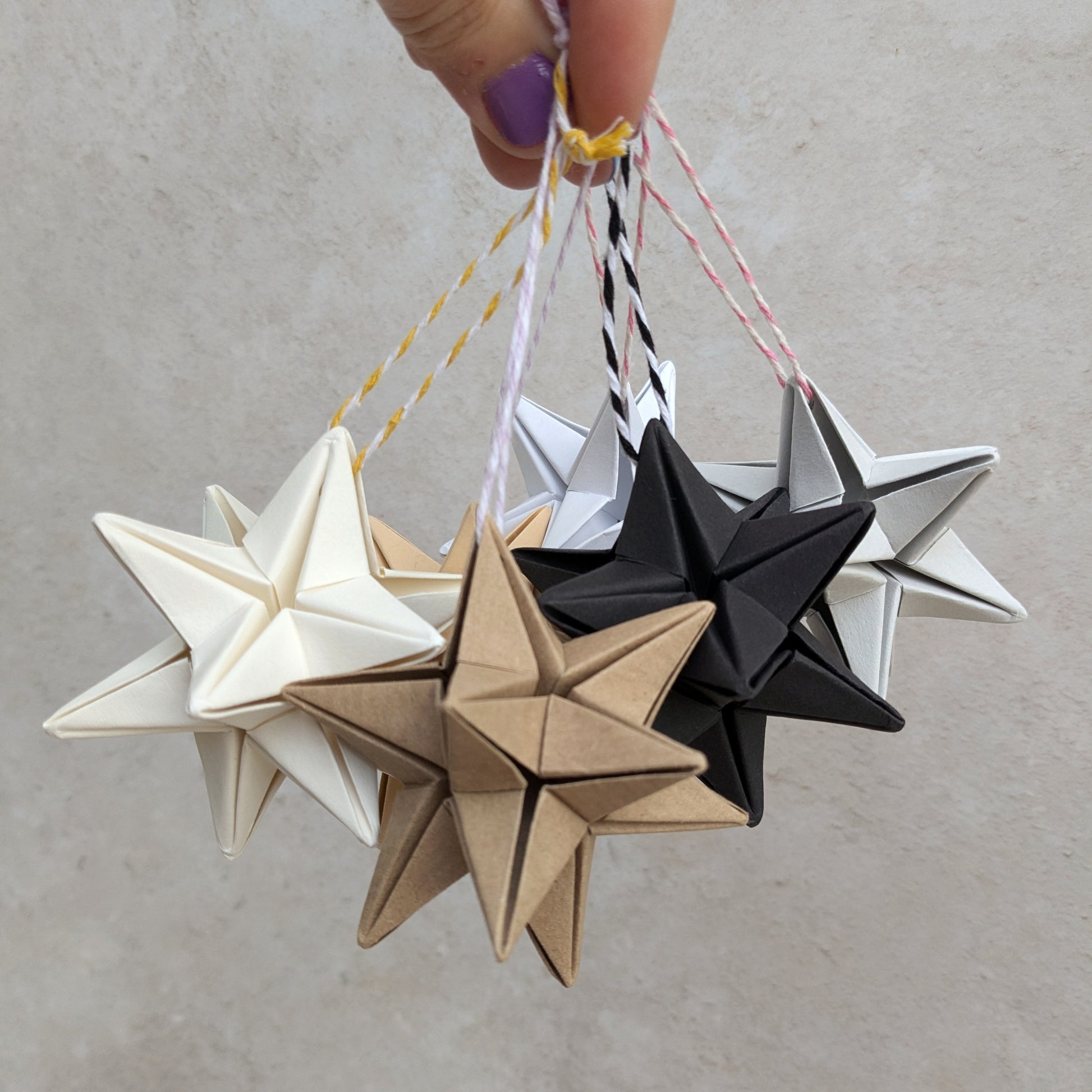Celebrate a more sustainable Christmas with these beautiful and eco-friendly origami star baubles. Each bauble is handcrafted from recycled paper and threaded on a loop of cotton twine, making them ready to hang and add a unique touch to your neutral home decor. These quirky ornaments are a perfect alternative to traditional Christmas decorations and can also be used as party decorations throughout the year.