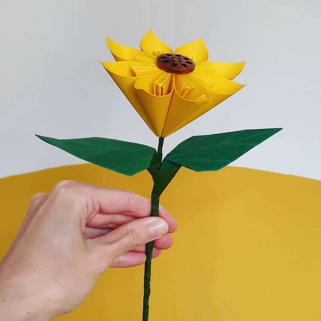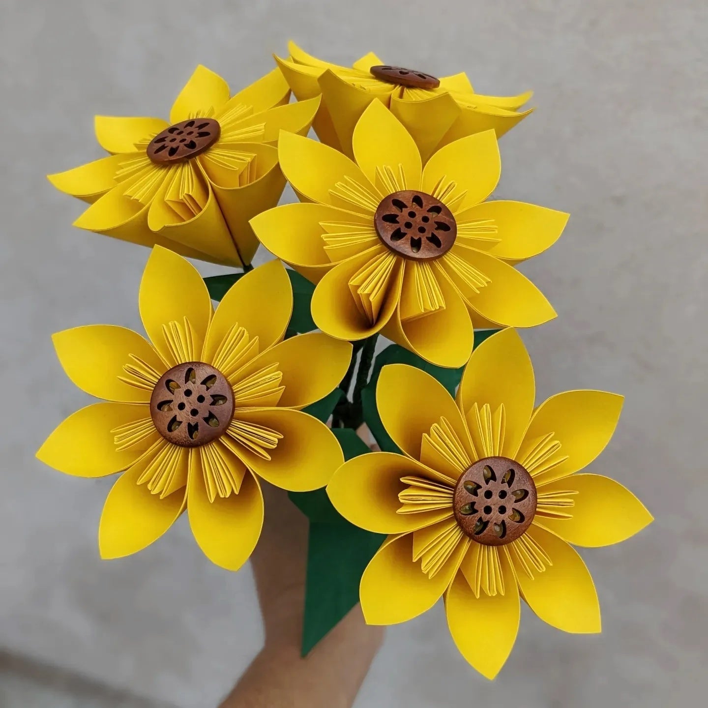 Bring eternal sunshine into your life with origami sunflowers! Each sunny bloom is handmade from golden yellow recycled paper with a brown button centre and two green origami leaves. This bouquet of three paper flowers makes a fabulous birthday or Mother's Day gift. It's a gorgeous present for your wife on your first wedding anniversary too as it fits perfectly with the traditional gift to be made from paper.