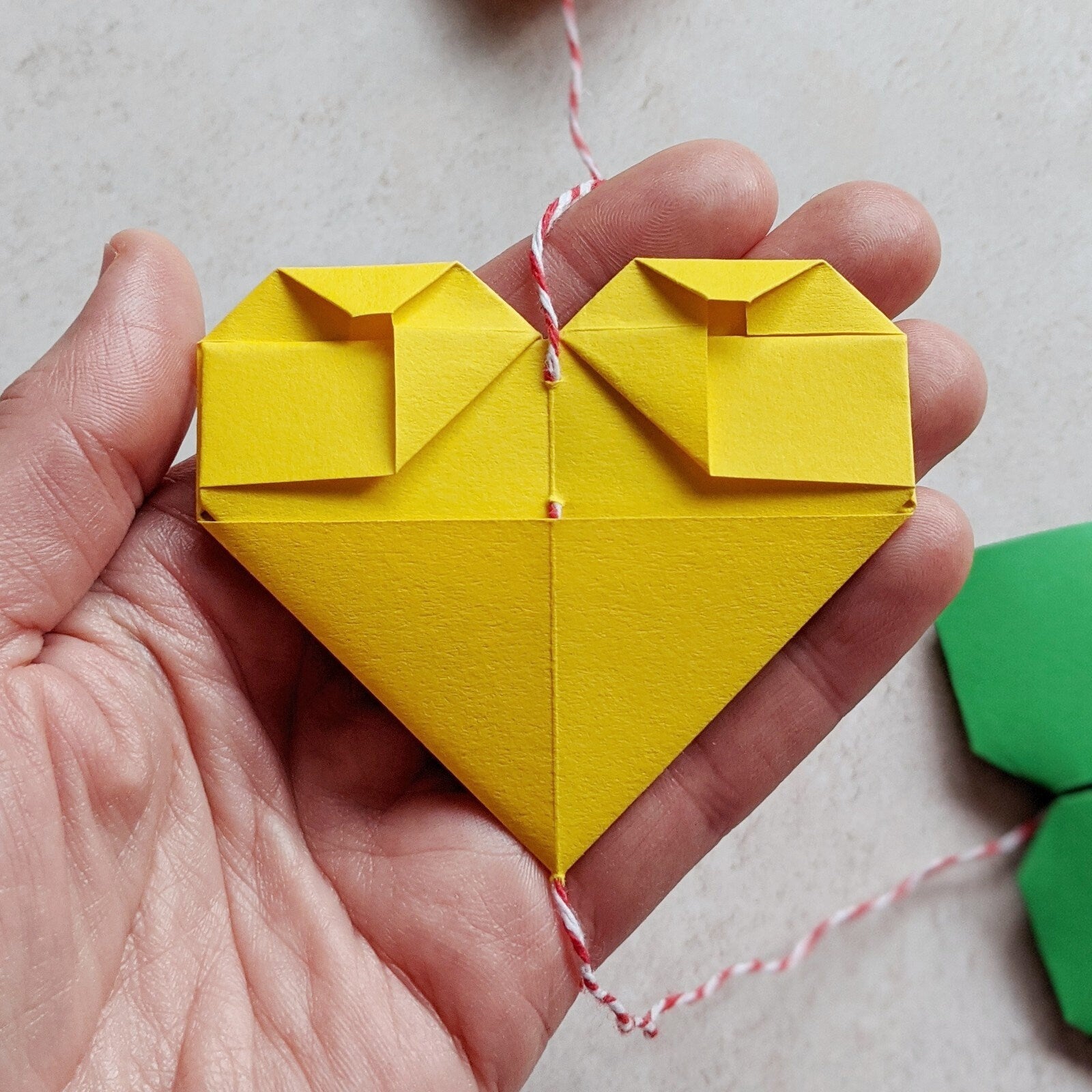 The garland hangs vertically and has 7 origami hearts at intervals of 20cm. Each heart is folded from a single square of recycled paper and is threaded onto cotton twine.