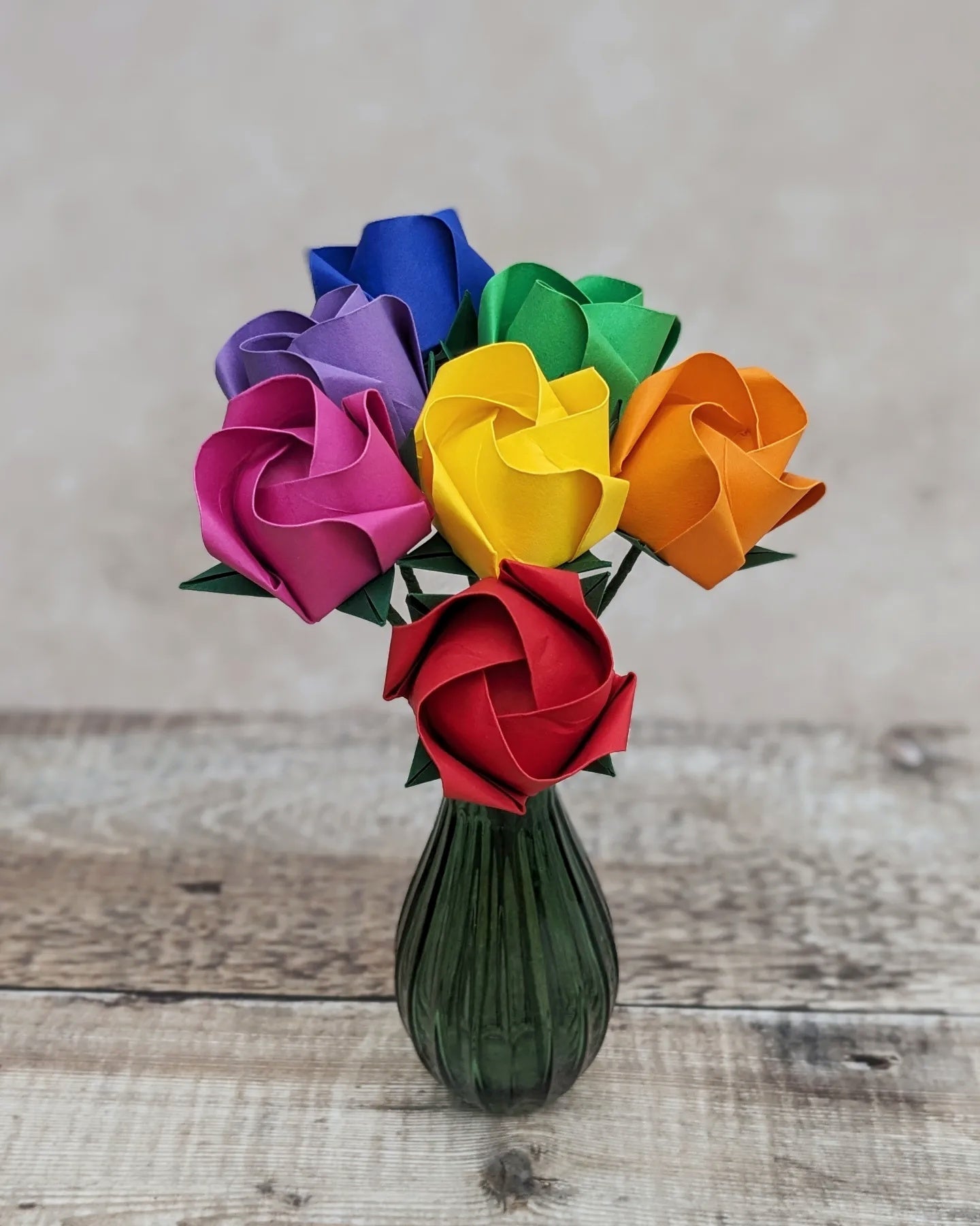 A bouquet of seven origami roses in rainbow colours folded from recycled paper 🌹 Rainbow lovers, this one's for you! These bold and beautiful paper roses make a fabulous gift for a LGBTQIA friend, or they could be used as a wedding bouquet or for a first wedding anniversary gift. Did you know the traditional material for a 1st anniversary present is paper?